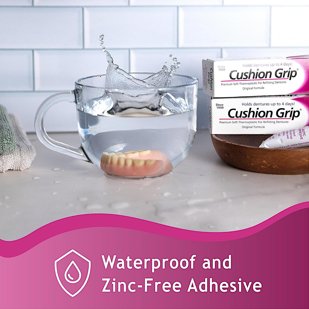 It isn’t a glue adhesive; it works like a soft reline. A single application lasts up to four days and is waterproof, so it won’t wash off during daily cleaning. Cushion Grip adheres to your dentures, not your gums.