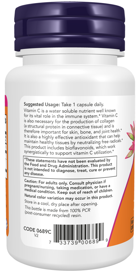 Vitamin C is a water soluble nutrient well known for its vital role in the immune system.* Vitamin C is also necessary for the production of collagen (a structural protein in connective tissue) and is therefore important for skin, bone, and joint health.* Vitamin C is needed for amino acid metabolism, neurotransmitter synthesis, and the utilization of many nutrients, such as folic acid and iron.* It is also a highly effective antioxidant that can help maintain healthy tissues by neutralizing free radicals generated during normal metabolism and exposure to environmental stressors.* This product includes bioflavonoids, which work synergistically to support vitamin C utilization.*